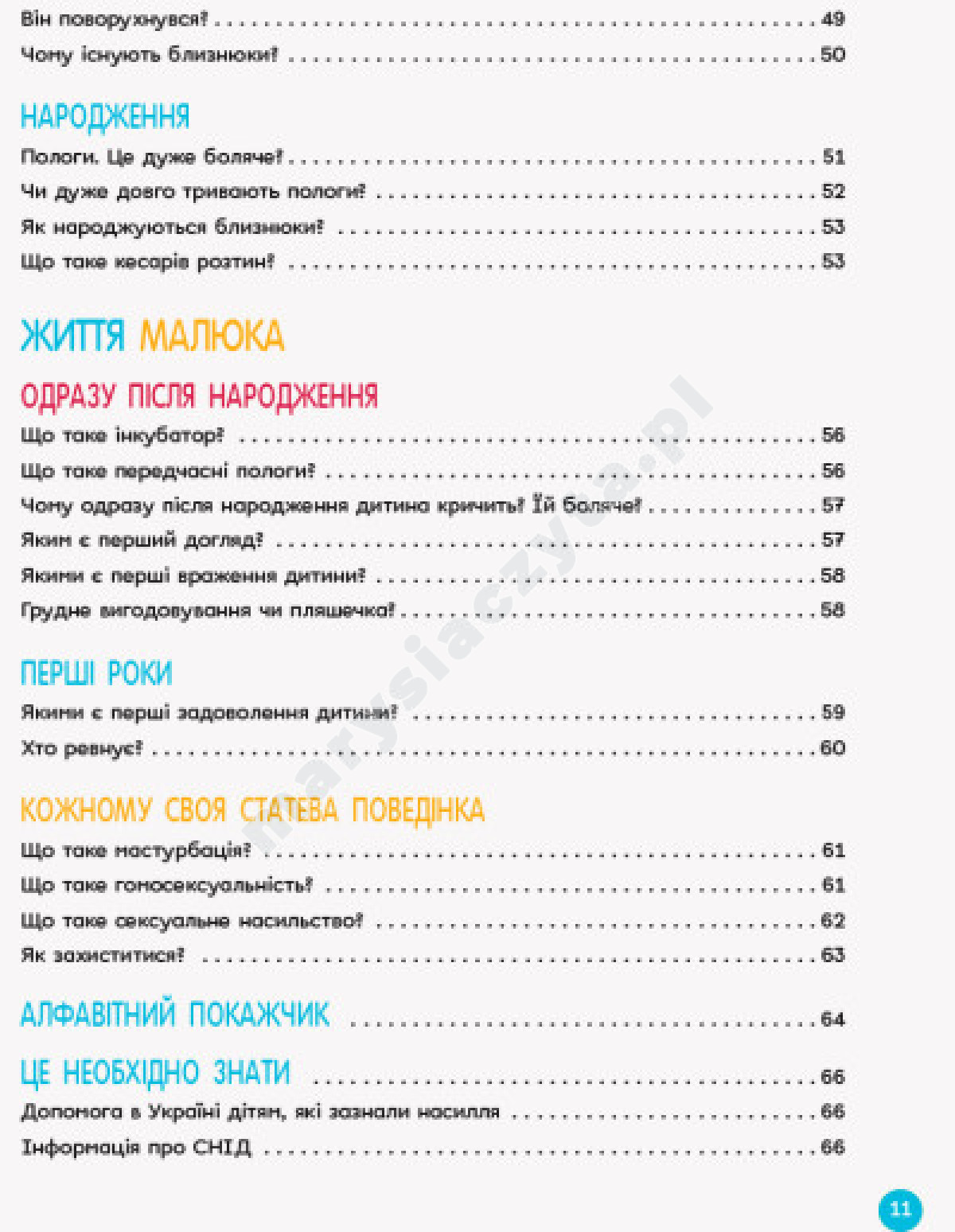 Oraz dużo informacji na temat przebiegu ciąży, porodu, ochrony przed przemocą itp. Wszystkie informacje są dobrze zilustrowane, aby ułatwić dzieciom zrozumienie.