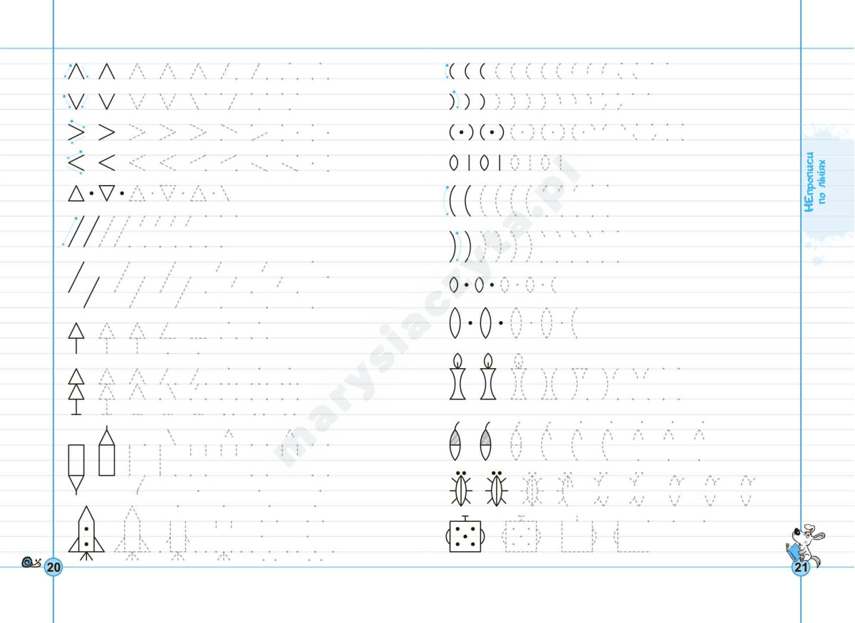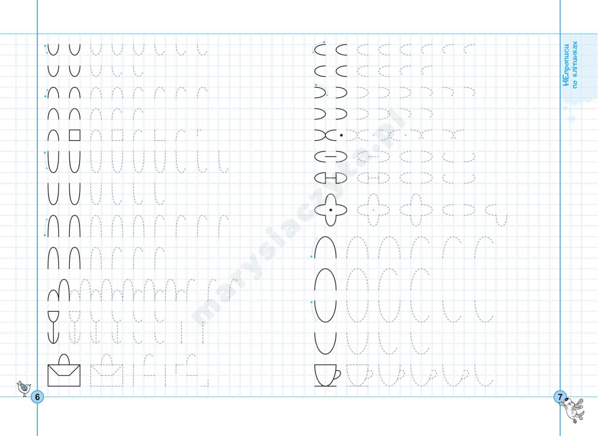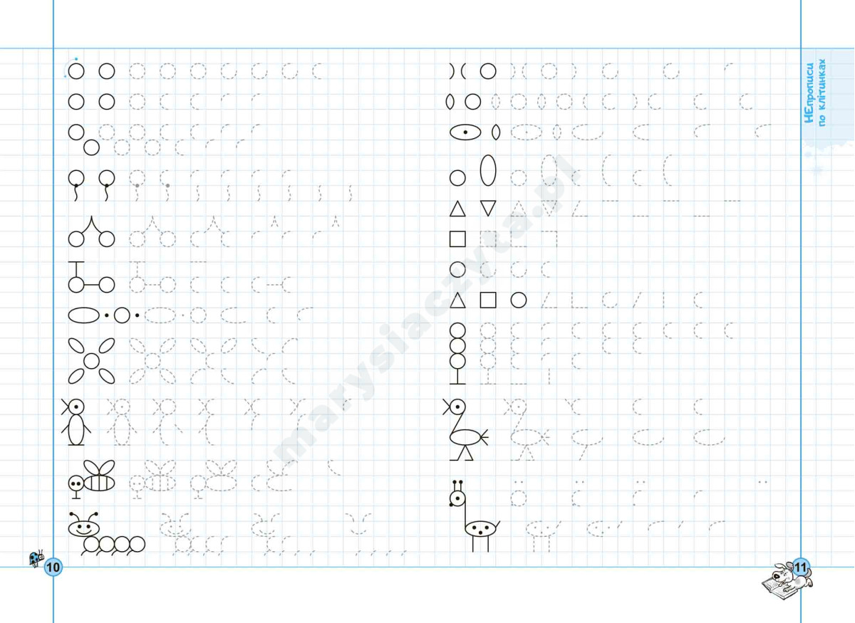 У посібнику зібрані «Непрописи по клітинках», «Непрописи по лініях» «Непрописи. Цифри та знаки», «Непрописи. Друковані букви», « Майже прописи у косу лінію». Унікальні запатентовані графічні сітки, які використано у зошиті, допоможуть дитині стандартизувати розмір і пропорції букв та їх елементів, навчать дотримуватися однакової відстані між літерами (елементами), нахилу тощо.